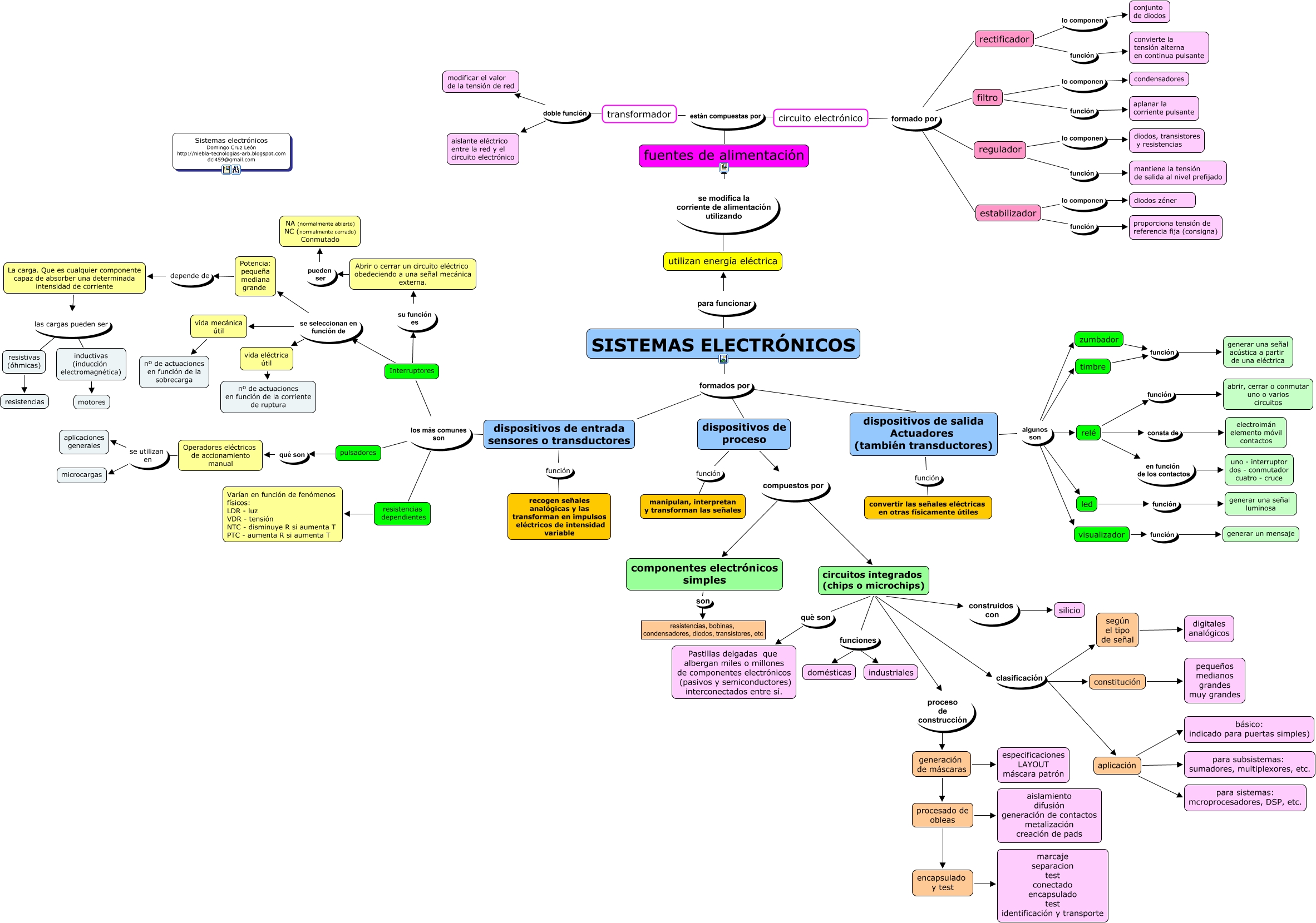 Este Cmap, tiene información relacionada con: sistemas electronicos, dispositivos de entrada sensores o transductores los más comunes son Interruptores, compuestos por componentes electrónicos simples, circuitos integrados (chips o microchips) funciones domésticas, dispositivos de entrada sensores o transductores función recogen señales analógicas y las transforman en impulsos eléctricos de intensidad variable, circuito electrónico formado por filtro, generación de máscaras especificaciones LAYOUT máscara patrón, procesado de obleas encapsulado y test, fuentes de alimentación están compuestas por circuito electrónico, dispositivos de entrada sensores o transductores los más comunes son pulsadores, fuentes de alimentación están compuestas por transformador, Interruptores se seleccionan en función de Potencia: pequeña mediana grande, compuestos por circuitos integrados (chips o microchips), resistencias dependientes Varían en función de fenómenos físicos: LDR - luz VDR - tensión NTC - disminuye R si aumenta T PTC - aumenta R si aumenta T, dispositivos de entrada sensores o transductores los más comunes son resistencias dependientes, transformador doble función aislante eléctrico entre la red y el circuito electrónico, SISTEMAS ELECTRÓNICOS para funcionar utilizan energía eléctrica, Potencia: pequeña mediana grande depende de La carga. Que es cualquier componente capaz de absorber una determinada intensidad de corriente, rectificador lo componen conjunto de diodos, transformador doble función modificar el valor de la tensión de red, dispositivos de salida Actuadores (también transductores) algunos son relé