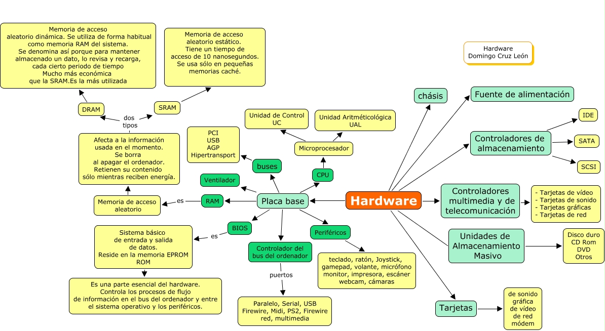 Este Cmap, tiene información relacionada con: hardware, BIOS es Sistema básico de entrada y salida de datos. Reside en la memoria EPROM ROM, SRAM Memoria de acceso aleatorio estático. Tiene un tiempo de acceso de 10 nanosegundos. Se usa sólo en pequeñas memorias caché., Hardware Fuente de alimentación, Controladores multimedia y de telecomunicación - Tarjetas de vídeo - Tarjetas de sonido - Tarjetas gráficas - Tarjetas de red, Placa base RAM, Placa base Ventilador, Unidades de Almacenamiento Masivo Disco duro CD Rom DVD Otros, Afecta a la información usada en el momento. Se borra al apagar el ordenador. Retienen su contenido sólo mientras reciben energía. dos tipos SRAM, Memoria de acceso aleatorio Afecta a la información usada en el momento. Se borra al apagar el ordenador. Retienen su contenido sólo mientras reciben energía., Placa base CPU, DRAM Memoria de acceso aleatorio dinámica. Se utiliza de forma habitual como memoria RAM del sistema. Se denomina así porque para mantener almacenado un dato, lo revisa y recarga, cada cierto periodo de tiempo Mucho más económica que la SRAM.Es la más utilizada, buses PCI USB AGP Hipertransport, Afecta a la información usada en el momento. Se borra al apagar el ordenador. Retienen su contenido sólo mientras reciben energía. dos tipos DRAM, Hardware chásis, Placa base Controlador del bus del ordenador, Hardware Controladores de almacenamiento, Controlador del bus del ordenador puertos Paralelo, Serial, USB Firewire, Midi, PS2, Firewire red, multimedia, Hardware Unidades de Almacenamiento Masivo, Hardware Tarjetas, Controladores de almacenamiento IDE