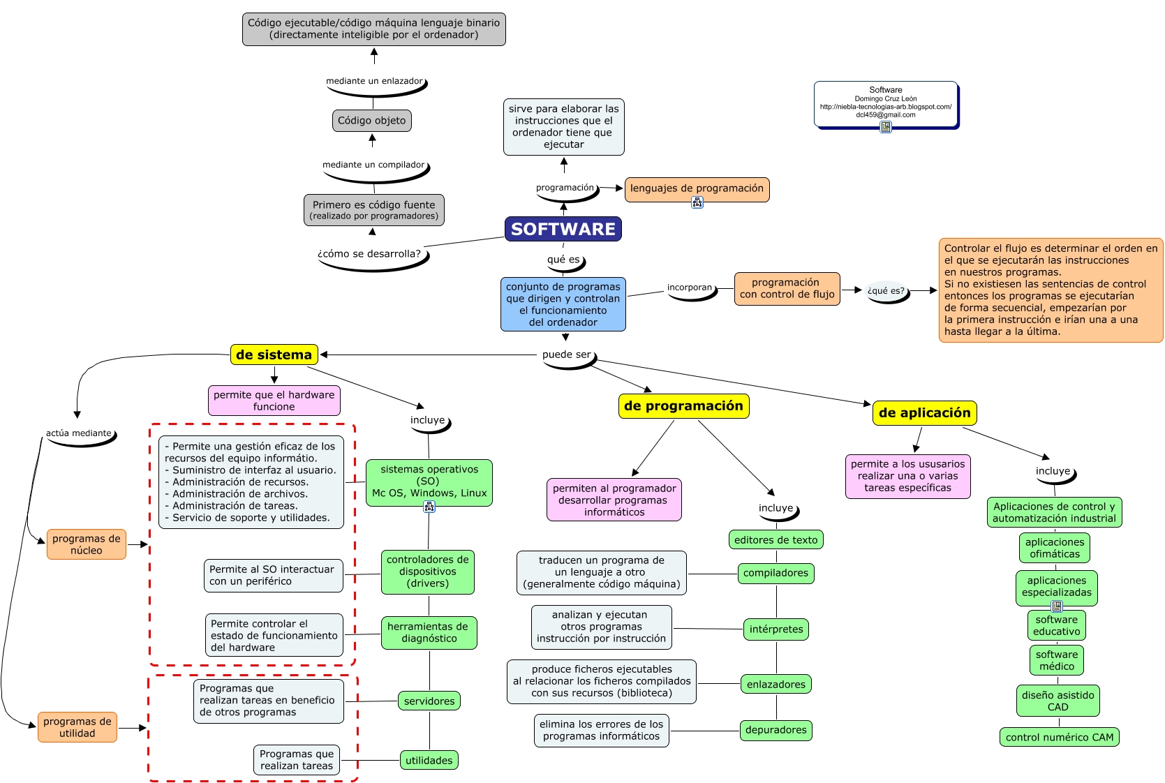 Este Cmap, tiene información relacionada con: software, de programación incluye editores de texto, controladores de dispositivos (drivers) herramientas de diagnóstico, conjunto de programas que dirigen y controlan el funcionamiento del ordenador incorporan programación con control de flujo, de sistema actúa mediante programas de utilidad, programas de núcleo, de aplicación incluye Aplicaciones de control y automatización industrial, depuradores elimina los errores de los programas informáticos, conjunto de programas que dirigen y controlan el funcionamiento del ordenador puede ser de aplicación, Aplicaciones de control y automatización industrial aplicaciones ofimáticas, enlazadores produce ficheros ejecutables al relacionar los ficheros compilados con sus recursos (biblioteca), compiladores traducen un programa de un lenguaje a otro (generalmente código máquina), aplicaciones ofimáticas software educativo, conjunto de programas que dirigen y controlan el funcionamiento del ordenador puede ser de programación, de programación permiten al programador desarrollar programas informáticos, SOFTWARE qué es conjunto de programas que dirigen y controlan el funcionamiento del ordenador, de aplicación permite a los ususarios realizar una o varias tareas específicas, software educativo software médico, sistemas operativos (SO) Mc OS, Windows, Linux - Permite una gestión eficaz de los recursos del equipo informátio. - Suministro de interfaz al usuario. - Administración de recursos. - Administración de archivos. - Administración de tareas. - Servicio de soporte y utilidades., sistemas operativos (SO) Mc OS, Windows, Linux controladores de dispositivos (drivers), controladores de dispositivos (drivers) Permite al SO interactuar con un periférico