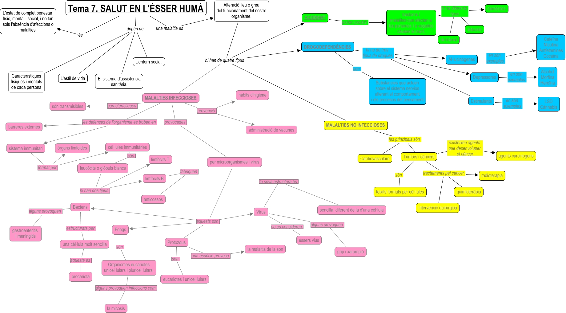 Este Cmap, tiene información relacionada con: Salut en l'ésser humà, ACCIDENT poden produir trastorns i malalties que afecten a les persones i a vegades causen la mort., Virus no es consideren éssers vius, MALALTIES INFECCIOSES les defenses de l'organisme es troben en sistema immunitari, trastorns i malalties que afecten a les persones i a vegades causen la mort. hi ha diferents tipus de trànsit, Tema 7. SALUT EN L'ÉSSER HUMÀ depèn de L'estil de vida, una cèl·lula molt sencilla aquesta és procariota, Tema 7. SALUT EN L'ÉSSER HUMÀ depèn de L'entorn social., per microorganismes i virus aquests són Bacteris, Bacteris alguns provoquen gastroenteritis i meningitis, Protozous una espècie provoca la malaltia de la son, Tema 7. SALUT EN L'ÉSSER HUMÀ depèn de Característiques físiques i mentals de cada persona, Tumors i càncers tractaments pel càncer intervenció quirúrgica, Tumors i càncers tractaments pel càncer radioteràpia, trastorns i malalties que afecten a les persones i a vegades causen la mort. hi ha diferents tipus laborals, Depressores en són exemples Alcohol Morfina Heroïna, Bacteris estructurats per una cèl·lula molt sencilla, MALALTIES NO INFECCIOSES les principals són Cardiovasculars, per microorganismes i virus aquests són Virus, DROGODEPENDÈNCIES hi ha de tres tipus de drogues Depressores, per microorganismes i virus aquests són Protozous