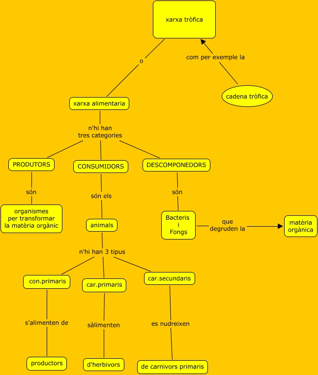 Este Cmap, tiene información relacionada con: xarxa tròfica, xarxa tròfica o xarxa alimentaria, con.primaris s'alimenten de productors, xarxa alimentaria n'hi han tres categories CONSUMIDORS, CONSUMIDORS són els animals, DESCOMPONEDORS són Bacteris i Fongs, car.primaris sàlimenten d'herbivors, xarxa alimentaria n'hi han tres categories PRODUTORS, xarxa alimentaria n'hi han tres categories DESCOMPONEDORS, animals n'hi han 3 tipus car.primaris, PRODUTORS són organismes per transformar la matèria orgànic, cadena tròfica com per exemple la xarxa tròfica, animals n'hi han 3 tipus car.secundaris, Bacteris i Fongs que degruden la matèria orgànica, animals n'hi han 3 tipus con.primaris, car.secundaris es nudreixen de carnivors primaris