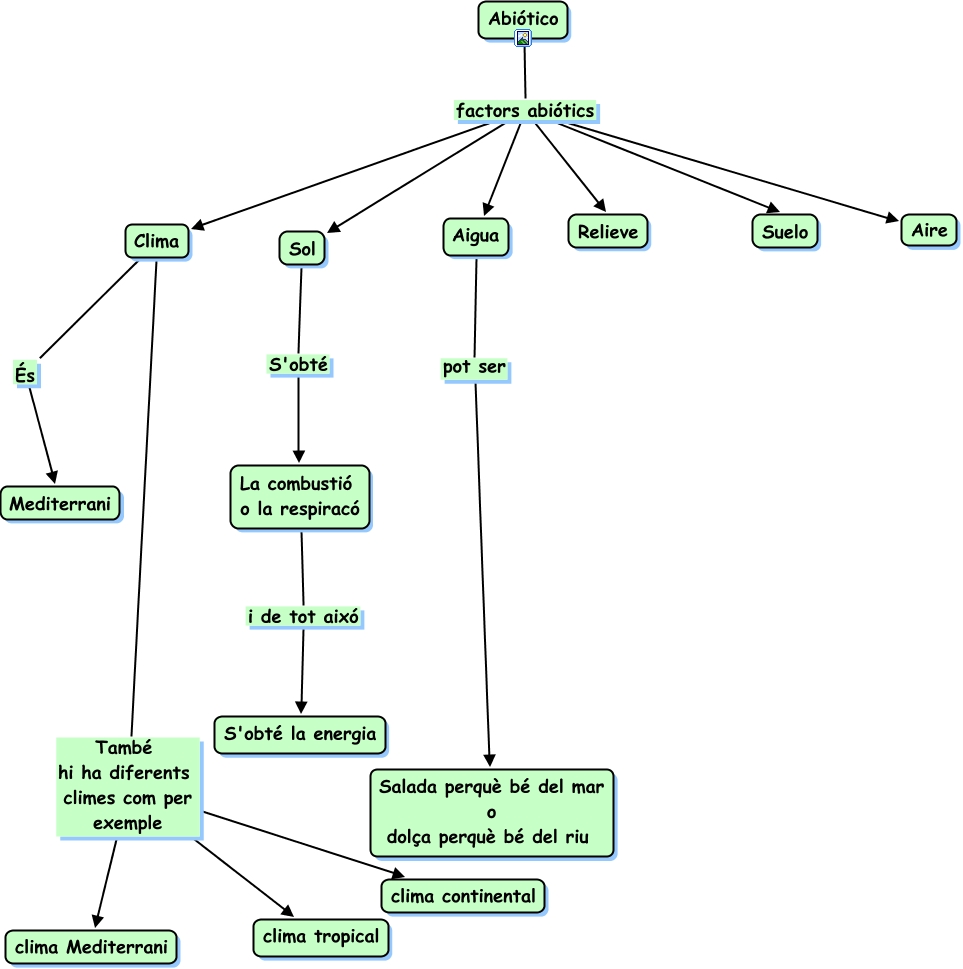 Este Cmap, tiene información relacionada con: abiotico, Abiótico factors abiótics Suelo, Sol S'obté La combustió o la respiracó, Abiótico factors abiótics Aigua, Aigua pot ser Salada perquè bé del mar o dolça perquè bé del riu, Clima També hi ha diferents climes com per exemple clima Mediterrani, Clima També hi ha diferents climes com per exemple clima continental, Abiótico factors abiótics Sol, Abiótico factors abiótics Clima, Clima És Mediterrani, La combustió o la respiracó i de tot aixó S'obté la energia, Clima També hi ha diferents climes com per exemple clima tropical, Abiótico factors abiótics Aire, Abiótico factors abiótics Relieve