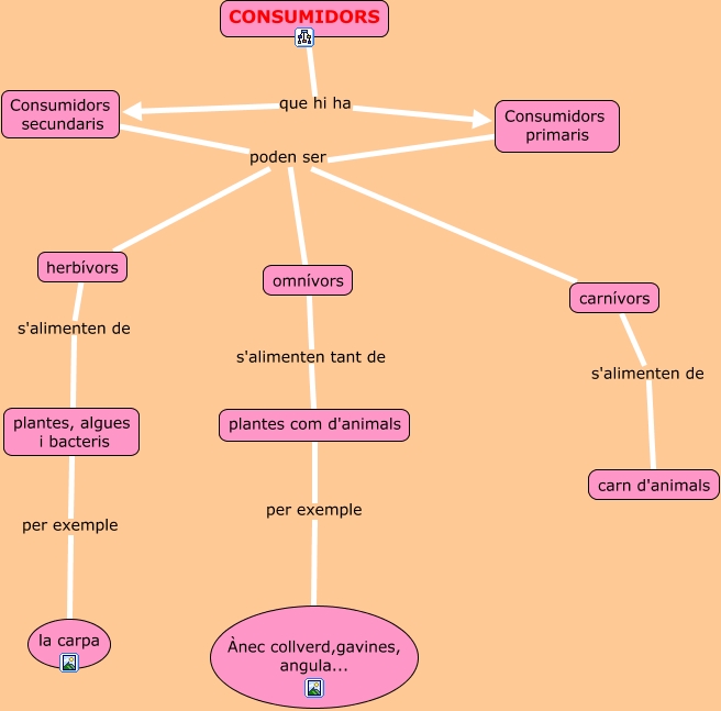 Este Cmap, tiene información relacionada con: CONSUMIDORS, Consumidors secundaris poden ser herbívors, Consumidors primaris poden ser herbívors, Consumidors primaris poden ser carnívors, carnívors s'alimenten de carn d'animals, plantes, algues i bacteris per exemple la carpa, Consumidors primaris poden ser omnívors, CONSUMIDORS que hi ha Consumidors primaris, Consumidors secundaris poden ser omnívors, omnívors s'alimenten tant de plantes com d'animals, herbívors s'alimenten de plantes, algues i bacteris, Consumidors secundaris poden ser carnívors, CONSUMIDORS que hi ha Consumidors secundaris, plantes com d'animals per exemple Ànec collverd,gavines, angula...