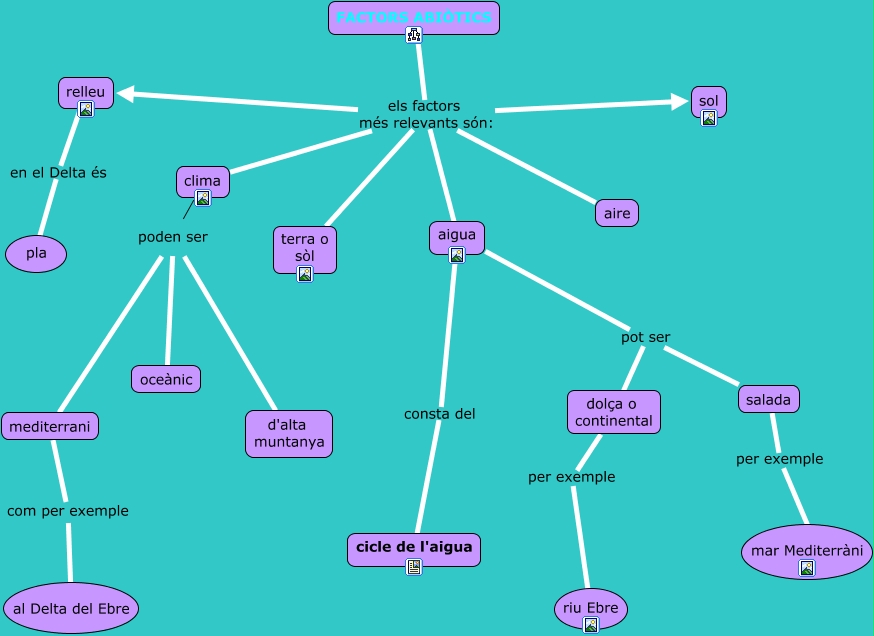 Este Cmap, tiene información relacionada con: Factors abiòtics, aigua pot ser salada, FACTORS ABIÒTICS els factors més relevants són: sol, dolça o continental per exemple riu Ebre, aigua consta del cicle de l'aigua, clima poden ser d'alta muntanya, clima poden ser oceànic, mediterrani com per exemple al Delta del Ebre, relleu en el Delta és pla, FACTORS ABIÒTICS els factors més relevants són: aigua, salada per exemple mar Mediterràni, aigua pot ser dolça o continental, clima poden ser mediterrani, FACTORS ABIÒTICS els factors més relevants són: clima, FACTORS ABIÒTICS els factors més relevants són: aire, FACTORS ABIÒTICS els factors més relevants són: relleu, FACTORS ABIÒTICS els factors més relevants són: terra o sòl