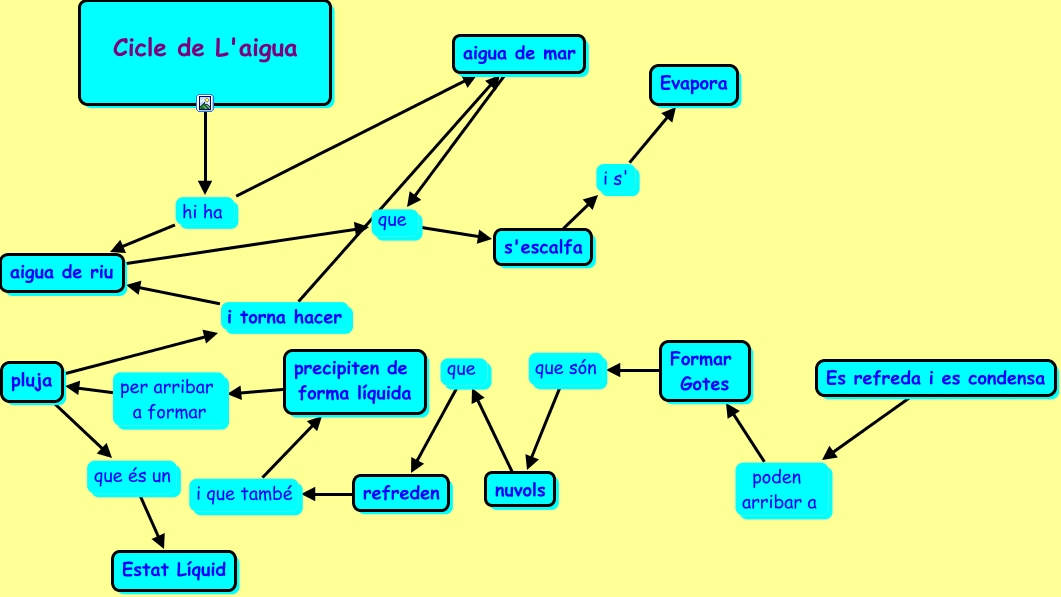 Aquest mapa conceptual conté informació relacionada amb: Cicle de l'aigua, Cicle de L'aigua hi ha aigua de mar, pluja que és un Estat Líquid, pluja i torna hacer aigua de riu, nuvols que refreden, Es refreda i es condensa poden arribar a Formar Gotes, aigua de mar que s'escalfa, aigua de riu que s'escalfa, precipiten de forma líquida per arribar a formar pluja, pluja i torna hacer aigua de mar, Cicle de L'aigua hi ha aigua de riu, refreden i que també precipiten de forma líquida, s'escalfa i s' Evapora, Formar Gotes que són nuvols