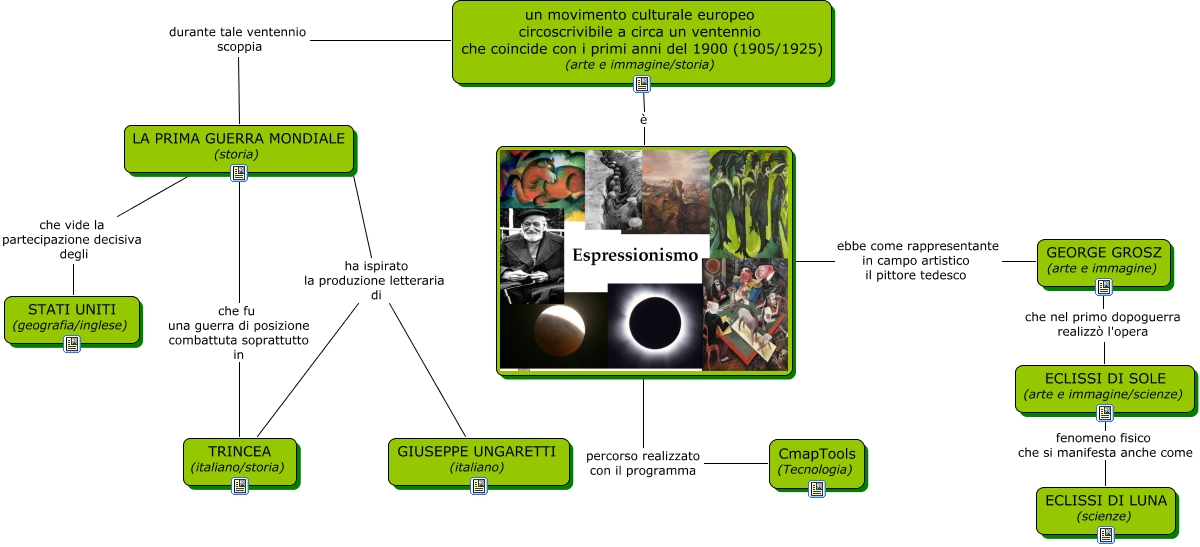 Questa Cmap, creata con IHMC CmapTools, contiene informazioni relative a: ESPRESSIONISMO IPERTESTO, TRINCEA (italiano/storia) ha ispirato la produzione letteraria di GIUSEPPE UNGARETTI (italiano), GEORGE GROSZ (arte e immagine) che nel primo dopoguerra realizzò l'opera ECLISSI DI SOLE (arte e immagine/scienze), è un movimento culturale europeo circoscrivibile a circa un ventennio che coincide con i primi anni del 1900 (1905/1925) (arte e immagine/storia), percorso realizzato con il programma CmapTools (Tecnologia), LA PRIMA GUERRA MONDIALE (storia) che vide la partecipazione decisiva degli STATI UNITI (geografia/inglese), un movimento culturale europeo circoscrivibile a circa un ventennio che coincide con i primi anni del 1900 (1905/1925) (arte e immagine/storia) durante tale ventennio scoppia LA PRIMA GUERRA MONDIALE (storia), ebbe come rappresentante in campo artistico il pittore tedesco GEORGE GROSZ (arte e immagine), TRINCEA (italiano/storia) ha ispirato la produzione letteraria di LA PRIMA GUERRA MONDIALE (storia), ECLISSI DI SOLE (arte e immagine/scienze) fenomeno fisico che si manifesta anche come ECLISSI DI LUNA (scienze), LA PRIMA GUERRA MONDIALE (storia) che fu una guerra di posizione combattuta soprattutto in TRINCEA (italiano/storia)