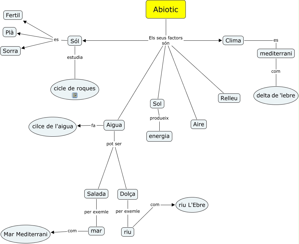 Este Cmap, tiene información relacionada con: ABIOTIC, Sol produeix energia, Dolça per exemle riu, mar com Mar Mediterrani, Abiotic Els seus factors són Relleu, Aigua pot ser Dolça, Aigua fa cilce de l'aigua, Abiotic Els seus factors són Sól, Clima es mediterrani, Abiotic Els seus factors són Aire, Aigua pot ser Salada, Sól es Fertil, Abiotic Els seus factors són Aigua, Sól es Plà, Abiotic Els seus factors són Clima, riu com riu L'Ebre, Abiotic Els seus factors són Sol, Sól estudia cicle de roques, Salada per exemle mar, Sól es Sorra, mediterrani com delta de 'lebre