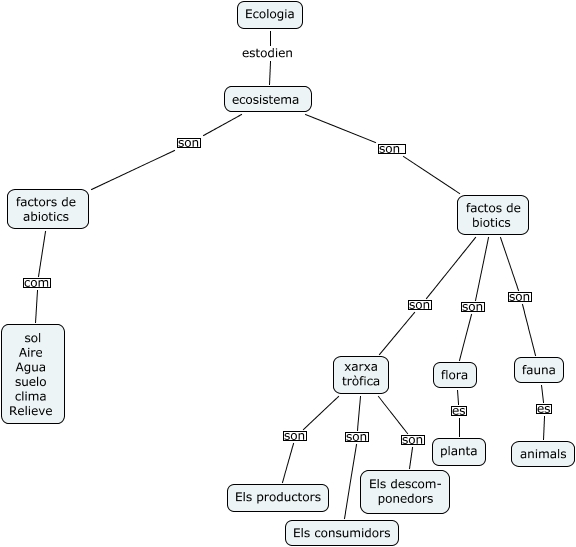 Aquest mapa conceptual conté informació relacionada amb: Ecologia, factos de biotics son xarxa tròfica, ecosistema son factos de biotics, Ecologia estodien ecosistema, flora es planta, xarxa tròfica son Els descom- ponedors, xarxa tròfica son Els consumidors, factos de biotics son flora, factors de abiotics com sol Aire Agua suelo clima Relieve, factos de biotics son fauna, ecosistema son factors de abiotics, fauna es animals, xarxa tròfica son Els productors