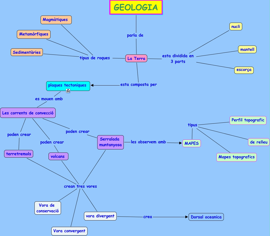 Este Cmap, tiene información relacionada con: Geologiar, vora divergent crea Dorsal oceanica, Les corrents de convecció poden crear terretremols, plaques tectoniques es mouen amb Les corrents de convecció, La Terra tipus de roques Sedimentàries, volcans crean tres vores Vora convergent, volcans crean tres vores Vora de conservació, Serralada muntanyosa crean tres vores Vora de conservació, La Terra esta dividida en 3 parts nucli, terretremols crean tres vores Vora de conservació, terretremols crean tres vores Vora convergent, MAPES tipus Mapes topografics, Serralada muntanyosa les observem amb MAPES, La Terra esta dividida en 3 parts escorça, La Terra tipus de roques Metamòrfiques, MAPES tipus de relleu, Serralada muntanyosa crean tres vores vora divergent, La Terra esta dividida en 3 parts mantell, terretremols crean tres vores vora divergent, volcans crean tres vores vora divergent, Serralada muntanyosa crean tres vores Vora convergent