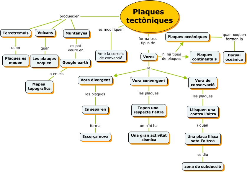 Este Cmap, tiene información relacionada con: Plaques tectòniques, Vora convergent les plaques Topen una respecte l'altra, Vores hi ha tipus de plaques Plaques oceàniques, Vores hi ha tipus de plaques Plaques continentals, Terretremols quan Plaques es mouen, Vores la Vora convergent, Plaques oceàniques quan xoquen formen la Dorsal oceànica, Vora divergent les plaques Es separen, Topen una respecte l'altra on n'hi ha Una gran activitat sísmica, Volcans quan Les plauqes xoquen, Llisquen una contra l'altra i quan Una placa llisca sota l'altrea, Plaques tectòniques forma tres tipus de Vores, Plaques tectòniques produeixen Muntanyes, Una placa llisca sota l'altrea es diu zona de subducció, Muntanyes es pot veure en Google earth, Plaques tectòniques produeixen Volcans, Vores la Vora de conservació, Plaques tectòniques es modifiquen Amb la corrent de convecció, Google earth o en els Mapes topografics, Vora de conservació les plaques Llisquen una contra l'altra, Plaques tectòniques produeixen Terretremols