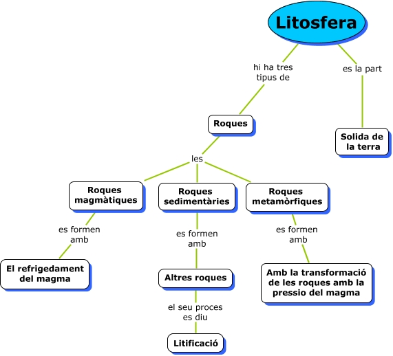Este Cmap, tiene información relacionada con: litosfera, Roques magmàtiques es formen amb El refrigedament del magma, Roques les Roques magmàtiques, Altres roques el seu proces es diu Litificació, Litosfera hi ha tres tipus de Roques, Roques les Roques metamòrfiques, Roques metamòrfiques es formen amb Amb la transformació de les roques amb la pressio del magma, Roques sedimentàries es formen amb Altres roques, Litosfera es la part Solida de la terra, Roques les Roques sedimentàries