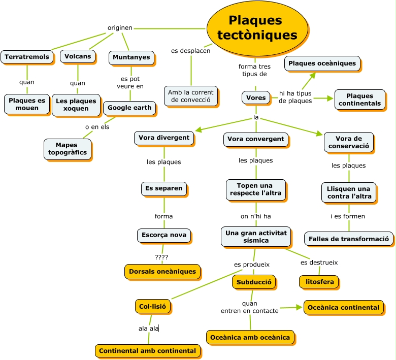 Aquest mapa conceptual conté informació relacionada amb: Plaques tectòniques, Vora de conservació les plaques Llisquen una contra l'altra, Vora divergent les plaques Es separen, Una gran activitat sísmica es destrueix litosfera, Topen una respecte l'altra on n'hi ha Una gran activitat sísmica, Plaques tectòniques originen Muntanyes, Es separen forma Escorça nova, Escorça nova ???? Dorsals oneàniques, Plaques tectòniques es desplacen Amb la corrent de convecció, Plaques tectòniques originen Volcans, Subducció quan entren en contacte Oceànica amb oceànica, Google earth o en els Mapes topogràfics, Plaques tectòniques originen Terratremols, Col·lisió ala ala Continental amb continental, Muntanyes es pot veure en Google earth, Una gran activitat sísmica es produeix Col·lisió, Vores la Vora de conservació, Terratremols quan Plaques es mouen, Llisquen una contra l'altra i es formen Falles de transformació, Vora convergent les plaques Topen una respecte l'altra, Vores la Vora divergent