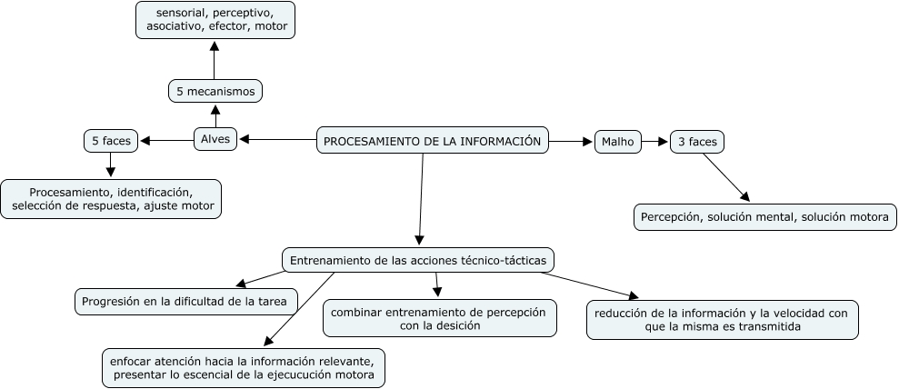 Este Cmap, tiene información relacionada con: Tavares, 3 faces ???? Percepción, solución mental, solución motora, PROCESAMIENTO DE LA INFORMACIÓN ???? Alves, Entrenamiento de las acciones técnico-tácticas ???? Progresión en la dificultad de la tarea, PROCESAMIENTO DE LA INFORMACIÓN ???? Entrenamiento de las acciones técnico-tácticas, Malho ???? 3 faces, Alves ???? 5 faces, 5 faces ???? Procesamiento, identificación, selección de respuesta, ajuste motor, Entrenamiento de las acciones técnico-tácticas ???? reducción de la información y la velocidad con que la misma es transmitida, Entrenamiento de las acciones técnico-tácticas ???? enfocar atención hacia la información relevante, presentar lo escencial de la ejecucución motora, 5 mecanismos ???? sensorial, perceptivo, asociativo, efector, motor, Alves ???? 5 mecanismos, PROCESAMIENTO DE LA INFORMACIÓN ???? Malho, Entrenamiento de las acciones técnico-tácticas ???? combinar entrenamiento de percepción con la desición