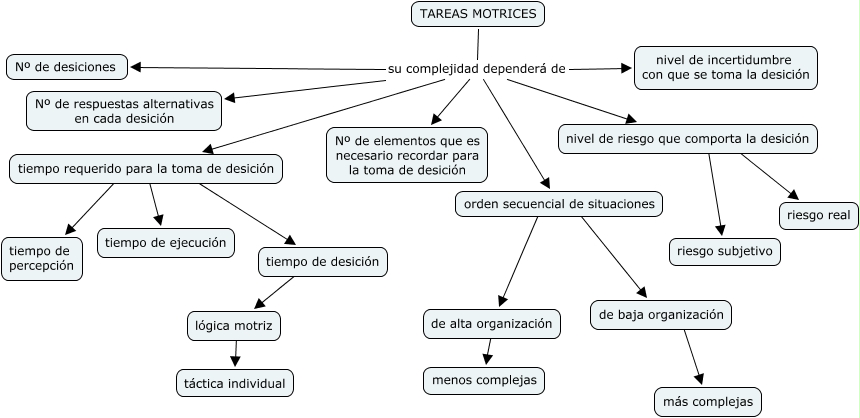 Este Cmap, tiene información relacionada con: Sanchez Bañuelos 2, TAREAS MOTRICES su complejidad dependerá de Nº de desiciones, TAREAS MOTRICES su complejidad dependerá de Nº de respuestas alternativas en cada desición, TAREAS MOTRICES su complejidad dependerá de nivel de riesgo que comporta la desición, tiempo requerido para la toma de desición ???? tiempo de desición, orden secuencial de situaciones ???? de baja organización, orden secuencial de situaciones ???? de alta organización, tiempo requerido para la toma de desición ???? tiempo de ejecución, nivel de riesgo que comporta la desición ???? riesgo real, TAREAS MOTRICES su complejidad dependerá de nivel de incertidumbre con que se toma la desición, nivel de riesgo que comporta la desición ???? riesgo subjetivo, TAREAS MOTRICES su complejidad dependerá de tiempo requerido para la toma de desición, de alta organización ???? menos complejas, lógica motriz ???? táctica individual, tiempo requerido para la toma de desición ???? tiempo de percepción, TAREAS MOTRICES su complejidad dependerá de Nº de elementos que es necesario recordar para la toma de desición, TAREAS MOTRICES su complejidad dependerá de orden secuencial de situaciones, tiempo de desición ???? lógica motriz, de baja organización ???? más complejas