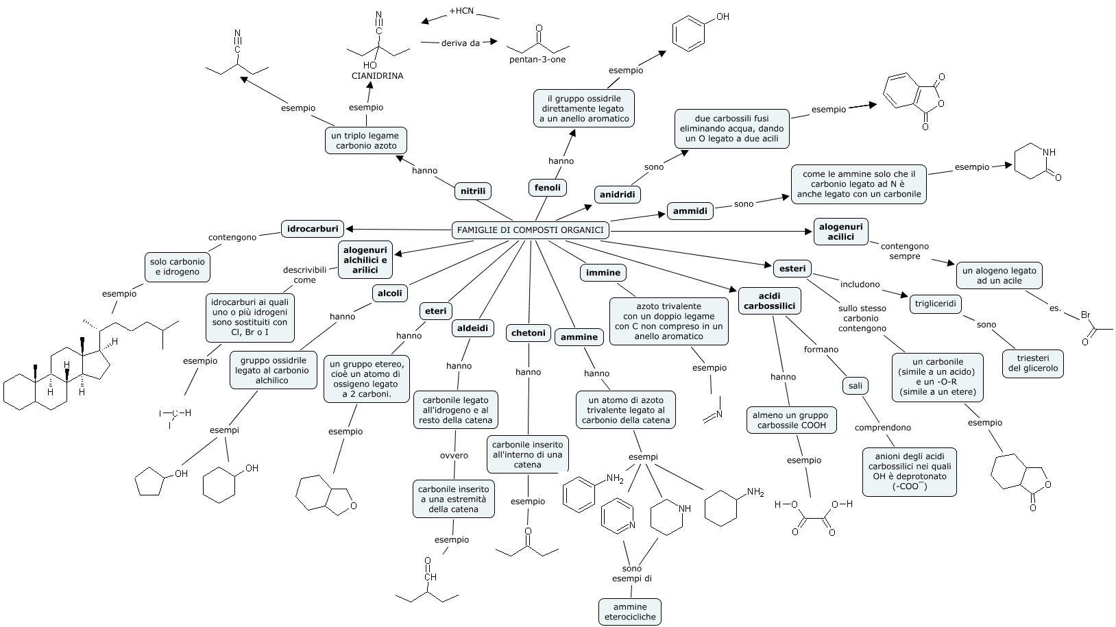 This Concept Map, created with IHMC CmapTools, has information related to: classificazione_descrittiva, sono esempi di ammine eterocicliche, un alogeno legato ad un acile es., acidi carbossilici hanno almeno un gruppo carbossile COOH, alogenuri alchilici e arilici descrivibili come idrocarburi ai quali uno o più idrogeni sono sostituiti con Cl, Br o I, esteri includono trigliceridi, idrocarburi contengono solo carbonio e idrogeno, pentan-3-one +HCN CIANIDRINA, come le ammine solo che il carbonio legato ad N è anche legato con un carbonile esempio, FAMIGLIE DI COMPOSTI ORGANICI alcoli, idrocarburi ai quali uno o più idrogeni sono sostituiti con Cl, Br o I esempio, trigliceridi sono triesteri del glicerolo, gruppo ossidrile legato al carbonio alchilico esempi, un carbonile (simile a un acido) e un -O-R (simile a un etere) esempio, FAMIGLIE DI COMPOSTI ORGANICI alogenuri acilici, azoto trivalente con un doppio legame con C non compreso in un anello aromatico esempio, ammidi sono come le ammine solo che il carbonio legato ad N è anche legato con un carbonile, almeno un gruppo carbossile COOH esempio, immine azoto trivalente con un doppio legame con C non compreso in un anello aromatico, sali comprendono anioni degli acidi carbossilici nei quali OH è deprotonato (-COO¯), FAMIGLIE DI COMPOSTI ORGANICI hanno il gruppo ossidrile direttamente legato a un anello aromatico