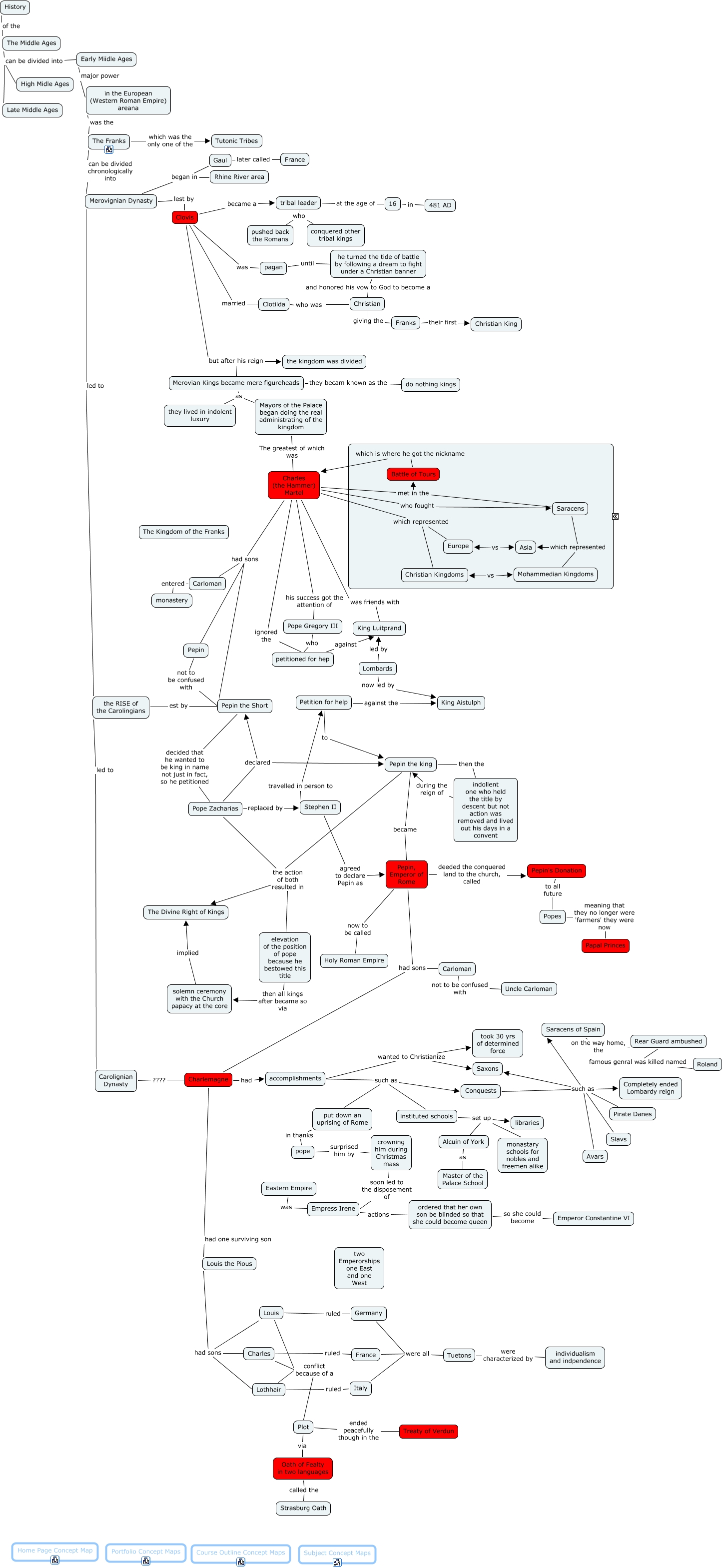 This Concept Map, created with IHMC CmapTools, has information related to: The Franks, The Middle Ages can be divided into Early Miidle Ages, Clotilda who was Christian, Charles (the Hammer) Martel had sons Carloman, Charles (the Hammer) Martel which represented Christian Kingdoms, Christian giving the Franks, tribal leader who conquered other tribal kings, accomplishments such as Conquests, Conquests such as Pirate Danes, Louis conflict because of a Plot, Saracens of Spain on the way home, the Rear Guard ambushed, Clovis but after his reign Merovian Kings became mere figureheads, Saracens met in the Battle of Tours, instituted schools set up Alcuin of York, Stephen II travelled in person to Petition for help, Pepin the king the action of both resulted in The Divine Right of Kings, Carloman entered monastery, accomplishments wanted to Christianize Saxons, Clovis but after his reign the kingdom was divided, Rear Guard ambushed famous genral was killed named Roland, The Middle Ages can be divided into High Midle Ages