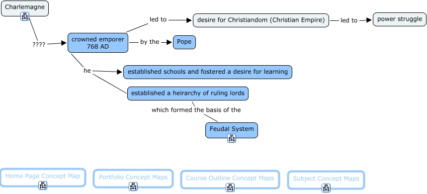 This Concept Map, created with IHMC CmapTools, has information related to: Charlemagne_Charles the Great, Charlemagne ???? crowned emporer 768 AD, established a heirarchy of ruling lords which formed the basis of the Feudal System, crowned emporer 768 AD he established schools and fostered a desire for learning, desire for Christiandom (Christian Empire) led to power struggle, crowned emporer 768 AD he established a heirarchy of ruling lords, crowned emporer 768 AD by the Pope, crowned emporer 768 AD led to desire for Christiandom (Christian Empire)