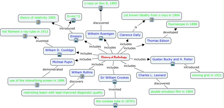 This Concept Map, created with IHMC CmapTools, has information related to: Radiology History Sweat- Thompson, History of Radiology includes William Rollins, Thomas Edison developed fluoroscope in 1898, Einstein introduced E=mc^2, History of Radiology includes Wilhelm Roentgen, Sir William Crookes invented the crookes tube in 1870's, Clarence Dally is 1st known fatality from x-rays in 1904, History of Radiology includes Gustav Bucky and H. Potter, History of Radiology includes William D. Coolidge, William D. Coolidge invented hot filament x-ray tube in 1913, Micheal Pupin demonstrated use of the intensifying screen in 1896, History of Radiology includes Charles L. Leonard, History of Radiology includes Clarence Dally, Charles L. Leonard discovered double emulsion film in 1904, Gustav Bucky and H. Potter introduced moving grid in 1921, Einstein introduced theory of relativity 1905, History of Radiology includes Thomas Edison, History of Radiology includes Micheal Pupin, History of Radiology includes Einstein, History of Radiology includes Sir William Crookes, William Rollins discovers restricting beam with lead improved diagnostic quality