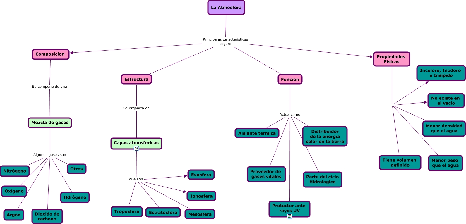 Este Cmap, tiene información relacionada con: La Atmosfera, Mezcla de gases Algunos gases son Argón, Funcion Actua como Protector ante rayos UV, Capas atmosfericas que son Estratosfera, Mezcla de gases Algunos gases son Nitrógeno, Propiedades Fisicas - No existe en el vacio, La Atmosfera Principales caracteristicas segun: Propiedades Fisicas, Funcion Actua como Parte del ciclo Hidrologico, La Atmosfera Principales caracteristicas segun: Estructura, Capas atmosfericas que son Exosfera, Composicion Se compone de una Mezcla de gases, Funcion Actua como Aislante termica, Funcion Actua como Proveedor de gases vitales, Capas atmosfericas que son Mesosfera, Estructura Se organiza en Capas atmosfericas, Funcion Actua como Distribuidor de la energia solar en la tierra, Propiedades Fisicas - Tiene volumen definido, Mezcla de gases Algunos gases son Hdrógeno, Capas atmosfericas que son Troposfera, Propiedades Fisicas - Menor densidad que el agua, Mezcla de gases Algunos gases son Otros