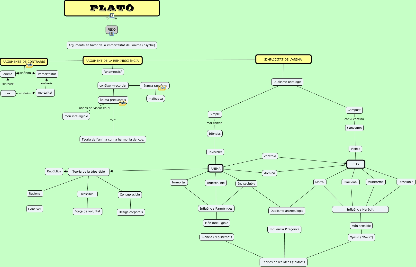 Este Cmap, tiene información relacionada con: Fedó, immortalitat de l'ànima, "anamnesis" ???? conèixer=recordar, Multiforme ???? Influència Heràclit, Influència Parmènides ???? Món intel·ligible, Mortal ???? ????, Compost canvi continu Canviants, ÀNIMA ???? Teoria de la tripartició, domina ???? ????, Indissoluble ???? Dualisme antropològic, PLATÓ formula FEDÓ, ànima preexisteix =/= Teoria de l'ànima com a harmonia del cos., Arguments en favor de la immortalitat de l'ànima (psyché) ???? ARGUMENT DE LA REMINISCIÈNCIA, Opinió ("Doxa") ???? Teories de les idees ("eîdos"), COS ???? Multiforme, ARGUMENT DE LA REMINISCIÈNCIA ???? "anamnesis", ÀNIMA ???? controla, ÀNIMA ???? domina, COS ???? Dissoluble, ARGUMENT DE LA REMINISCIÈNCIA ???? SIMPLICITAT DE L'ÀNIMA, conèixer=recordar ???? Tècnica Socràtica, Món sensible ???? Opinió ("Doxa")