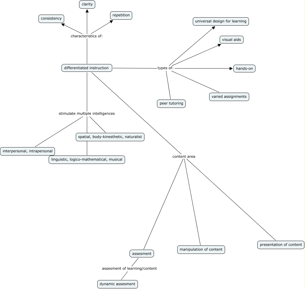 This Concept Map, created with IHMC CmapTools, has information related to: differentiated instruction, assesment assesment of learning/content dynamic assesment, differentiated instruction stimulate multiple intelligences linguistic, logico-mathematical, musical, differentiated instruction types of: varied assignments, differentiated instruction content area assesment, differentiated instruction content area presentation of content, differentiated instruction types of: universal design for learning, differentiated instruction content area manipulation of content, differentiated instruction characteristics of: clarity, differentiated instruction types of: peer tutoring, differentiated instruction stimulate multiple intelligences interpersonal, intrapersonal, differentiated instruction stimulate multiple intelligences spatial, body-kinesthetic, naturalist, differentiated instruction characteristics of: consistency, differentiated instruction types of: visual aids, differentiated instruction characteristics of: repetition, differentiated instruction types of: hands-on