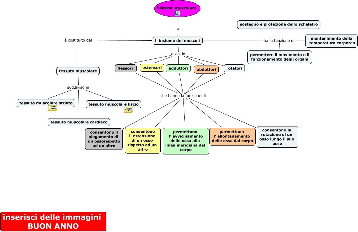 Questa Cmap, creata con IHMC CmapTools, contiene informazioni relative a: il sistema muscolare (Mariangela), rotatori che hanno la funzione di permettono l' avvicinamento delle ossa alla linea meridiana del corpo, rotatori che hanno la funzione di adduttori, l' insieme dei muscoli ha la funzione di sostegno e protezione dello scheletro, flessori che hanno la funzione di consentono la rotazione di un osso lungo il suo asse, rotatori che hanno la funzione di consentono il piegamento di un ossorispetto ad un altro, flessori che hanno la funzione di consentono il piegamento di un ossorispetto ad un altro, l' insieme dei muscoli divisi in adduttori, rotatori che hanno la funzione di consentono l' estensione di un osso rispetto ad un altro, flessori che hanno la funzione di adduttori, rotatori che hanno la funzione di abduttori, l' insieme dei muscoli divisi in abduttori, l' insieme dei muscoli divisi in estensori, flessori che hanno la funzione di estensori, tessuto muscolare suddiviso in tessuto muscolare cardiaco, flessori che hanno la funzione di permettono l' allontanamento delle ossa dal corpo, tessuto muscolare suddiviso in tessuto muscolare liscio, tessuto muscolare suddiviso in tessuto muscolare striato, flessori che hanno la funzione di consentono l' estensione di un osso rispetto ad un altro, l' insieme dei muscoli divisi in flessori, rotatori che hanno la funzione di consentono la rotazione di un osso lungo il suo asse