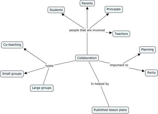 This Concept Map, created with IHMC CmapTools, has information related to: evan collaboration, Collaboration types Co-teaching, Collaboration types Small groups, Collaboration types Large groups, Collaboration important to Parity, Collaboration Is helped by Published lesson plans, Collaboration people that are involved Teachers, Collaboration people that are involved Parents, Collaboration important to Planning, Collaboration people that are involved Students, Collaboration people that are involved Principals