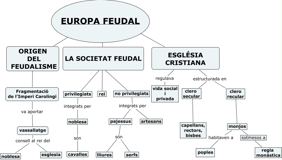 此概念图以 IHMC CmapTools 创建, 内含信息有关于: TEMA 2 EUROPA FEUDAL, pajessus són serfs, no privilegiats integrats per pajessus, Fragmentació de l'Imperi Carolingi va aportar vassallatge, privilegiats integrats per noblesa, monjos ???? regla monàstica, vassallatge consell al rei del noblesa, EUROPA FEUDAL ???? ORIGEN DEL FEUDALISME, ESGLÉSIA CRISTIANA regulava vida social i privada, noblesa són cavalles, pajessus són lliures, vassallatge consell al rei del esglesia, LA SOCIETAT FEUDAL ???? no privilegiats, clero secular ???? capellans, rectors, bisbes, ESGLÉSIA CRISTIANA estructurada en clero recular, ORIGEN DEL FEUDALISME ???? Fragmentació de l'Imperi Carolingi, monjos habitaven a poples, LA SOCIETAT FEUDAL ???? rei, LA SOCIETAT FEUDAL ???? privilegiats, clero recular ???? monjos, no privilegiats integrats per artesans