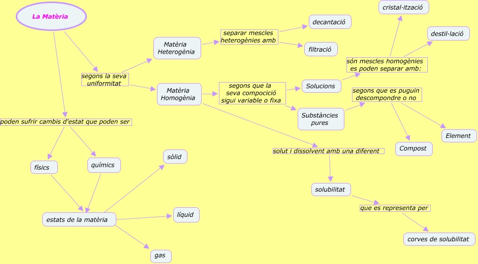 Este mapa conceptual tiene información relacionada a: La matèria, La Matèria segons la seva uniformitat Matèria Heterogènia, estats de la matèria ???? líquid, solubilitat que es representa per corves de solubilitat, Substàncies pures segons que es puguin descompondre o no Element, Matèria Heterogènia separar mescles heterogènies amb decantació, estats de la matèria ???? sòlid, físics ???? estats de la matèria, Matèria Homogènia segons que la seva compocició sigui variable o fixa Substàncies pures, químics ???? estats de la matèria, La Matèria poden sufrir cambis d'estat que poden ser químics, Solucions són mescles homogènies es poden separar amb: cristal·ització, Solucions són mescles homogènies es poden separar amb: destil·lació, Matèria Homogènia segons que la seva compocició sigui variable o fixa Solucions, Substàncies pures segons que es puguin descompondre o no Compost, Matèria Homogènia solut i dissolvent amb una diferent solubilitat, La Matèria segons la seva uniformitat Matèria Homogènia, estats de la matèria ???? gas, Matèria Heterogènia separar mescles heterogènies amb filtració, La Matèria poden sufrir cambis d'estat que poden ser físics