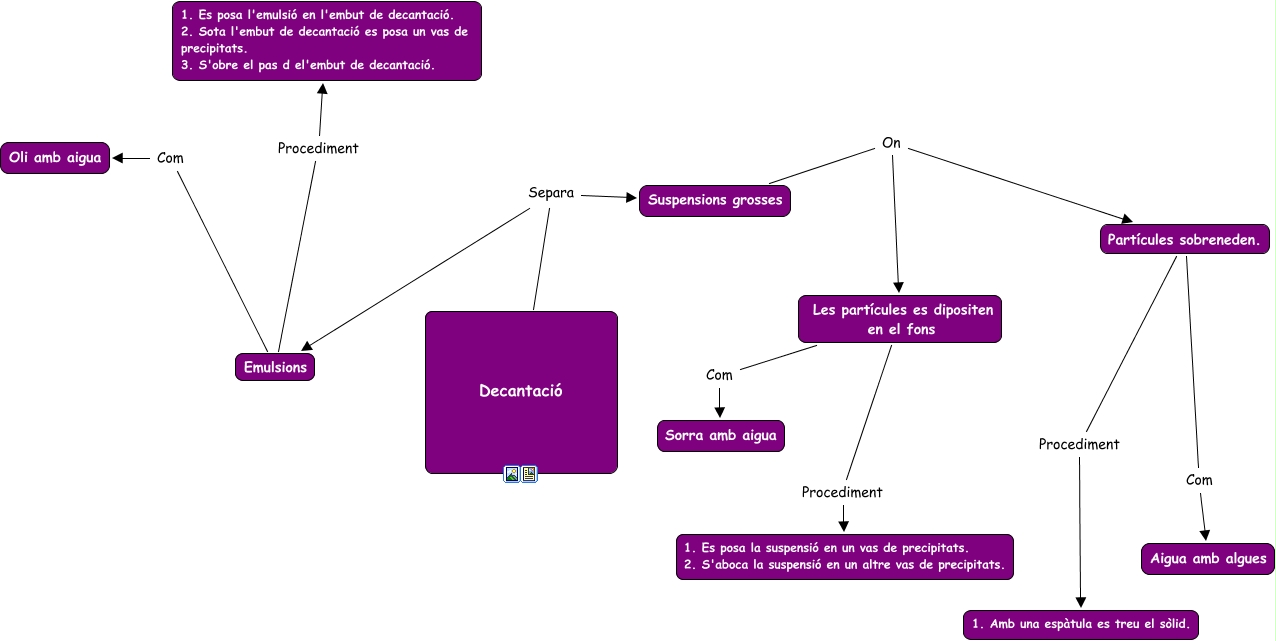 Este Cmap, tiene información relacionada con: Decantació, Les partícules es dipositen en el fons Com Sorra amb aigua, Partícules sobreneden. Com Aigua amb algues, Decantació Separa Suspensions grosses, Decantació Separa Emulsions, Emulsions Procediment 1. Es posa l'emulsió en l'embut de decantació. 2. Sota l'embut de decantació es posa un vas de precipitats. 3. S'obre el pas d el'embut de decantació., Suspensions grosses On Les partícules es dipositen en el fons, Les partícules es dipositen en el fons Procediment 1. Es posa la suspensió en un vas de precipitats. 2. S'aboca la suspensió en un altre vas de precipitats., Emulsions Com Oli amb aigua, Suspensions grosses On Partícules sobreneden., Partícules sobreneden. Procediment 1. Amb una espàtula es treu el sòlid.