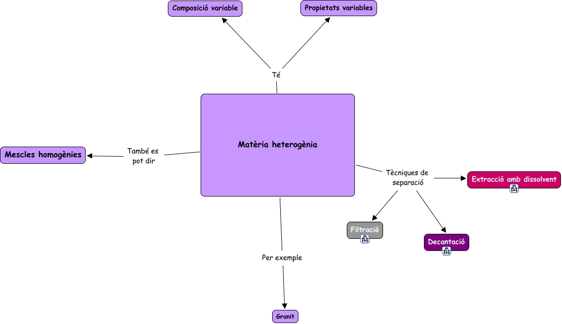 Este Cmap, tiene información relacionada con: Matèria heterogènia, Matèria heterogènia Té Composició variable, Matèria heterogènia Té Propietats variables, Matèria heterogènia Tècniques de separació Filtració, Matèria heterogènia Tècniques de separació Extracció amb dissolvent, Matèria heterogènia Per exemple Granit, Matèria heterogènia Tècniques de separació Decantació, Matèria heterogènia També es pot dir Mescles homogènies