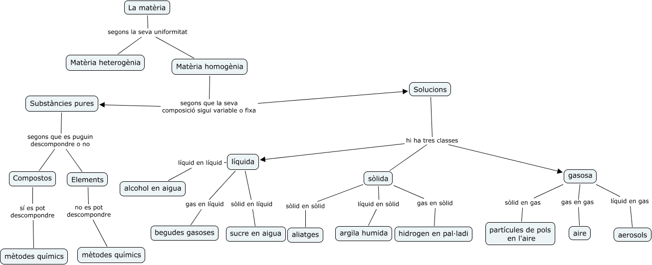 Este Cmap, tiene información relacionada con: Fisica i Quimica, La matèria segons la seva uniformitat Matèria homogènia, Solucions hi ha tres classes gasosa, Compostos sí es pot descompondre mètodes químics, Solucions hi ha tres classes líquida, sòlida gas en sòlid hidrogen en pal·ladi, Substàncies pures segons que es puguin descompondre o no Elements, gasosa líquid en gas aerosols, Matèria homogènia segons que la seva composició sigui variable o fixa Substàncies pures, Matèria homogènia segons que la seva composició sigui variable o fixa Solucions, sòlida líquid en sòlid argila humida, Solucions hi ha tres classes sòlida, líquida gas en líquid begudes gasoses, Substàncies pures segons que es puguin descompondre o no Compostos, gasosa sòlid en gas partícules de pols en l'aire, Elements no es pot descompondre mètodes químics, sòlida sòlid en sòlid aliatges, La matèria segons la seva uniformitat Matèria heterogènia, gasosa gas en gas aire, líquida sòlid en líquid sucre en aigua, líquida líquid en líquid alcohol en aigua