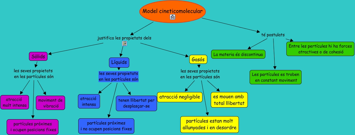 Este Cmap, tiene información relacionada con: Model cineticomolecular de la matèria, Gasós les seves propietats en les partícules són partícules estan molt allunyades i en desordre, Gasós les seves propietats en les partícules són es mouen amb total llibertat, Líquids les seves propietats en les partícules són atracció intensa, Líquids les seves propietats en les partícules són tenen llibertat per desplasçar-se, Model cineticomolecular justifica les propietats dels Líquids, Model cineticomolecular té postulats La materia és discontinua, Líquids les seves propietats en les partícules són partícules pròximes i no ocupen posicions fixes, Model cineticomolecular justifica les propietats dels Sòlids, Sòlids les seves propietats en les partícules són moviment de vibració, Gasós les seves propietats en les partícules són atracció negligible, Model cineticomolecular té postulats Les partícules es troben en constant moviment, Model cineticomolecular justifica les propietats dels Gasós, Sòlids les seves propietats en les partícules són atracció molt intensa, Sòlids les seves propietats en les partícules són partícules pròximes i ocupen posicions fixes, Model cineticomolecular té postulats Entre les pertícules hi ha forces atractives o de cohesió