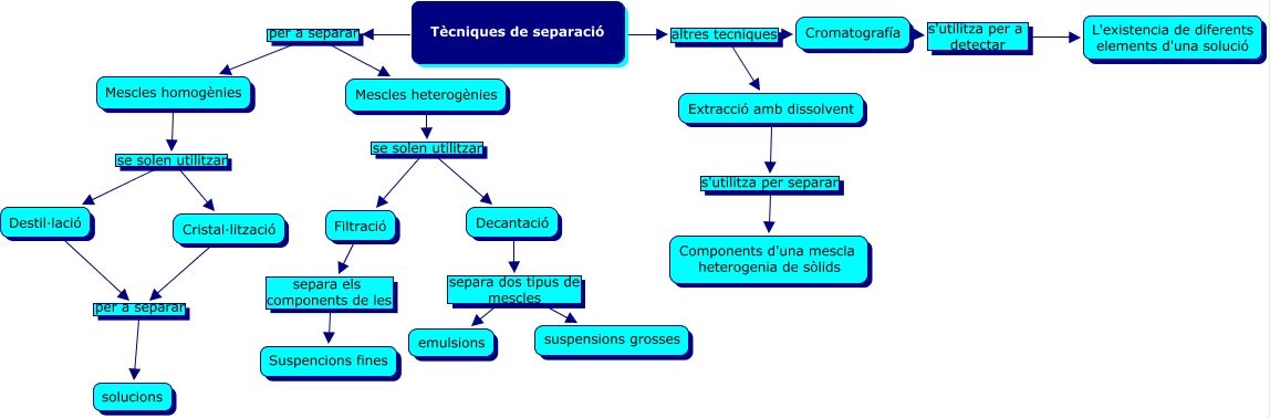 Este Cmap, tiene información relacionada con: tecniques de separació, Extracció amb dissolvent s'utilitza per separar Components d'una mescla heterogenia de sòlids, Mescles homogènies se solen utilitzar Cristal·lització, Mescles heterogènies se solen utilitzar Filtració, Decantació separa dos tipus de mescles suspensions grosses, Cromatografía s'utilitza per a detectar L'existencia de diferents elements d'una solució, Cristal·lització per a separar solucions, Destil·lació per a separar solucions, Mescles heterogènies se solen utilitzar Decantació, Tècniques de separació altres tecniques Cromatografía, Tècniques de separació altres tecniques Extracció amb dissolvent, Filtració separa els components de les Suspencions fines, Tècniques de separació per a separar Mescles homogènies, Mescles homogènies se solen utilitzar Destil·lació, Tècniques de separació per a separar Mescles heterogènies, Decantació separa dos tipus de mescles emulsions
