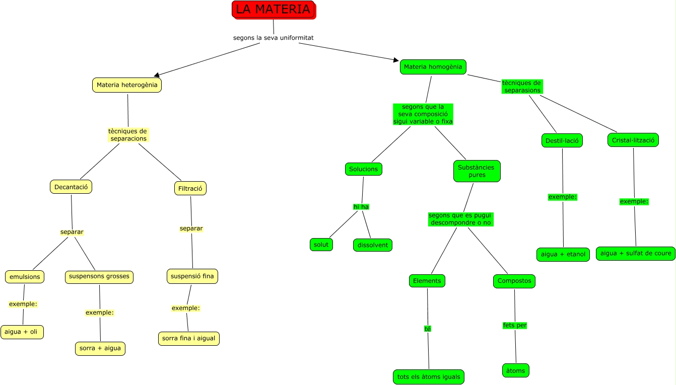 Este Cmap, tiene información relacionada con: la materia, Compostos fets per àtoms, Materia homogènia tècniques de separasions Cristal·lització, Materia homogènia segons que la seva composició sigui variable o fixa Solucions, Substàncies pures segons que es pugui descompondre o no Elements, Filtració separar suspensió fina, Solucions hi ha solut, emulsions exemple: aigua + oli, LA MATERIA segons la seva uniformitat Materia heterogènia, suspensió fina exemple: sorra fina i aigual, Destil·lació exemple: aigua + etanol, Cristal·lització exemple: aigua + sulfat de coure, Materia heterogènia tècniques de separacions Decantació, suspensons grosses exemple: sorra + aigua, Elements té tots els àtoms iguals, Materia homogènia tècniques de separasions Destil·lació, Materia homogènia segons que la seva composició sigui variable o fixa Substàncies pures, Decantació separar suspensons grosses, Substàncies pures segons que es pugui descompondre o no Compostos, Decantació separar emulsions, LA MATERIA segons la seva uniformitat Materia homogènia