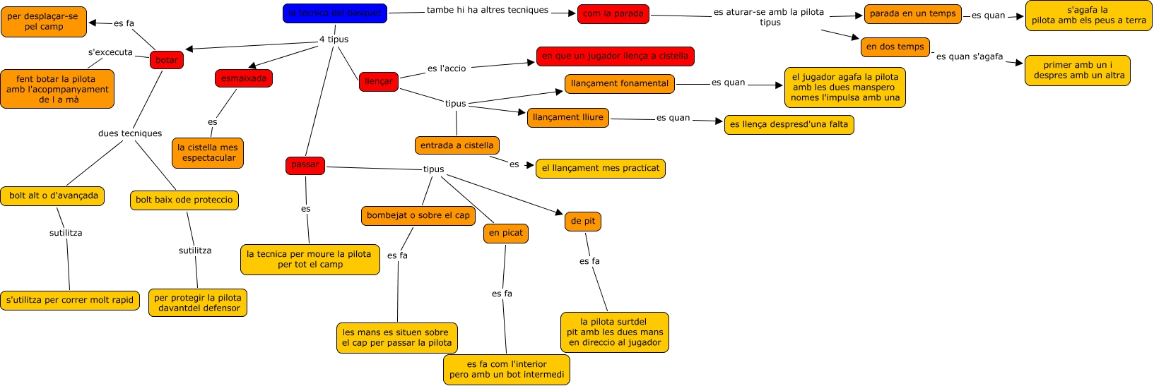 Este Cmap, tiene información relacionada con: la tecnica, la tecnica del basquet 4 tipus botar, botar dues tecniques bolt baix ode proteccio, com la parada es aturar-se amb la pilota tipus en dos temps, botar es fa per desplaçar-se pel camp, de pit es fa la pilota surtdel pit amb les dues mans en direccio al jugador, la tecnica del basquet 4 tipus llençar, llençar tipus llançament fonamental, esmaixada es la cistella mes espectacular, la tecnica del basquet tambe hi ha altres tecniques com la parada, llençar es l'accio en que un jugador llença a cistella, bombejat o sobre el cap es fa les mans es situen sobre el cap per passar la pilota, botar dues tecniques bolt alt o d'avançada, bolt alt o d'avançada sutilitza s'utilitza per correr molt rapid, passar tipus de pit, passar tipus en picat, llançament fonamental es quan el jugador agafa la pilota amb les dues manspero nomes l'impulsa amb una, entrada a cistella es el llançament mes practicat, en picat es fa es fa com l'interior pero amb un bot intermedi, botar s'excecuta fent botar la pilota amb l'acopmpanyament de l a mà, llençar tipus entrada a cistella