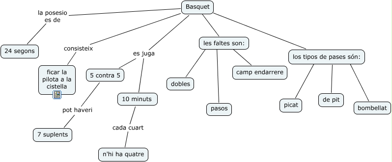 Este Cmap, tiene información relacionada con: Basquet, les faltes son: ???? camp endarrere, Basquet les les faltes son:, los tipos de pases són: ???? bombellat, Basquet ???? los tipos de pases són:, les faltes son: ???? pasos, les faltes son: ???? dobles, Basquet la posesio es de 24 segons, Basquet consisteix ficar la pilota a la cistella, Basquet es juga 5 contra 5, los tipos de pases són: ???? picat, 5 contra 5 pot haveri 7 suplents, Basquet es juga 10 minuts, los tipos de pases són: ???? de pit, 10 minuts cada cuart n'hi ha quatre
