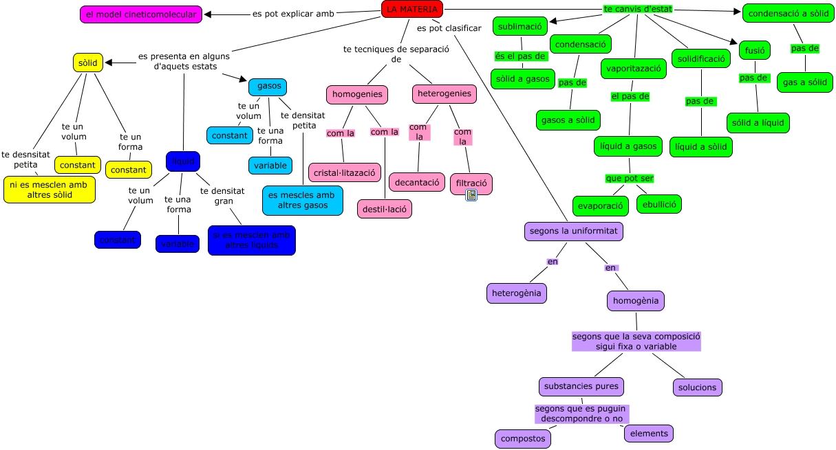 Este Cmap, tiene información relacionada con: la materia, líquid te una forma variable, homogènia segons que la seva composició sigui fixa o variable substancies pures, LA MATERIA te canvis d'estat condensació, líquid a gasos que pot ser evaporació, segons la uniformitat en heterogènia, sòlid te desnsitat petita ni es mesclen amb altres sòlid, homogènia segons que la seva composició sigui fixa o variable solucions, heterogenies com la filtració, gasos te una forma variable, condensació a sòlid pas de gas a sólid, condensació pas de gasos a sòlid, homogenies com la destil·lació, sòlid te un forma constant, substancies pures segons que es puguin descompondre o no elements, LA MATERIA te tecniques de separació de homogenies, LA MATERIA te canvis d'estat condensació a sòlid, LA MATERIA es presenta en alguns d'aquets estats gasos, gasos te densitat petita es mescles amb altres gasos, LA MATERIA es pot clasificar segons la uniformitat, LA MATERIA es presenta en alguns d'aquets estats líquid