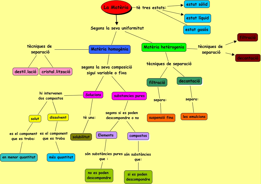 Este Cmap, tiene información relacionada con: La matèria, Matèria homogènia tècniques de separació cristal.lització, dissolvent es el component que es troba més quantitat, Elements són substàncies pures que : no es poden descompondre, La Matèria Segons la seva uniformitat Matèria homogènia, decantaciò separa: les emulcions, substancies pures segons si es poden descompondre o no Elements, La Matèria tè tres estats: estat sòlid, La Matèria tè tres estats: estat gasós, Matèria homogènia tècniques de separació destil.lació, La Matèria tè tres estats: estat líquid, Matèria hetèrogenia tècniques de separaciò decantaciò, Solucions hi intervenen dos compostos dissolvent, Solucions tè una: solubilitat, solut es el component que es troba: en menor quantitat, Matèria homogènia segons la seva composiciò sigui variable o fixa Solucions, Matèria hetèrogenia tècniques de separaciò filtraciò, La Matèria Segons la seva uniformitat Matèria hetèrogenia, Matèria hetèrogenia tècniques de separació decantació, filtraciò separa: suspensió fina, compostos són substàncies que: si es poden descompondre