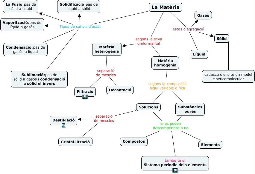 Este mapa conceptual tiene información relacionada a: La Matèria, La Matèria segons la seva uniformalitat Matèria heterogènia, cadascú d'ells té un model cineticomolecular Sòlid, Matèria heterogènia separació de mescles Decantació, Solucions si es poden descompondre o no també té el Sistema periodic dels elements, La Matèria segons la seva uniformalitat Matèria homogènia, La Matèria Tipus de canvis d'estat La Fusió:pas de sòlid a líquid, La Matèria Tipus de canvis d'estat Vaporització:pas de líquid a gasós, Solucions separació de mescles Destil·lació, Filtració separació de mescles Decantació, Substàncies pures si es poden descompondre o no també té el Sistema periodic dels elements, Solucions si es poden descompondre o no Elements, Matèria homogènia segons la composició sigui variable o fixa Substàncies pures, Substàncies pures si es poden descompondre o no Compostos, La Matèria estas d'agregació Líquid, Matèria homogènia segons la composició sigui variable o fixa Solucions, Cristal·lització separació de mescles Destil·lació, La Matèria Tipus de canvis d'estat Condensació:pas de gasós a líquid, La Matèria Tipus de canvis d'estat Sublimació:pas de sòlid a gasós i condensació a sòlid el invers, Substàncies pures si es poden descompondre o no Elements, Solucions si es poden descompondre o no Compostos