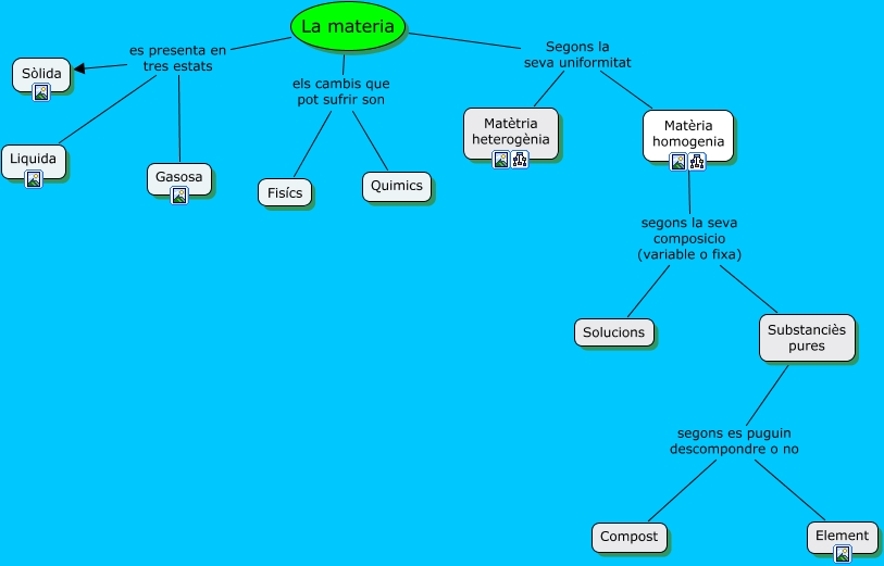 Este Cmap, tiene información relacionada con: La materia, La materia es presenta en tres estats Liquida, La materia els cambis que pot sufrir son Quimics, La materia es presenta en tres estats Sòlida, La materia Segons la seva uniformitat Matèria homogenia, Matèria homogenia segons la seva composicio (variable o fixa) Solucions, La materia els cambis que pot sufrir son Fisícs, Substanciès pures segons es puguin descompondre o no Compost, La materia es presenta en tres estats Gasosa, Matèria homogenia segons la seva composicio (variable o fixa) Substanciès pures, Substanciès pures segons es puguin descompondre o no Element, La materia Segons la seva uniformitat Matètria heterogènia