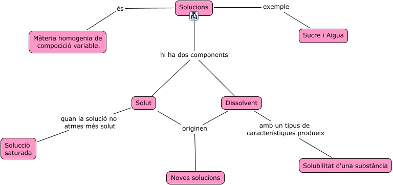 Este Cmap, tiene información relacionada con: Sólucions, Solut quan la solució no atmes més solut Solucciò saturada, Solucions exemple Sucre i Aigua, Solucions és Màteria homogenia de compocició variable., Solut originen Noves solucions, Dissolvent originen Noves solucions, Solucions hi ha dos components Dissolvent, Solucions hi ha dos components Solut, Dissolvent amb un tipus de característiques produeix Solubilitat d'una substància