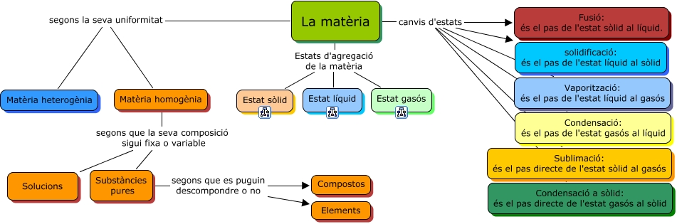 Este Cmap, tiene información relacionada con: La matèria, La matèria Estats d'agregació de la matèria Estat gasós, La matèria canvis d'estats Fusió: és el pas de l'estat sòlid al líquid., Matèria homogènia segons que la seva composició sigui fixa o variable Solucions, La matèria Estats d'agregació de la matèria Estat líquid, Substàncies pures segons que es puguin descompondre o no Elements, La matèria canvis d'estats Condensació a sòlid: és el pas directe de l'estat gasós al sòlid, La matèria canvis d'estats Sublimació: és el pas directe de l'estat sòlid al gasós, La matèria canvis d'estats Condensació: és el pas de l'estat gasós al líquid, La matèria Estats d'agregació de la matèria Estat sòlid, Substàncies pures segons que es puguin descompondre o no Compostos, La matèria canvis d'estats Vaporització: és el pas de l'estat líquid al gasós, La matèria segons la seva uniformitat Matèria heterogènia, La matèria canvis d'estats solidificació: és el pas de l'estat líquid al sòlid, La matèria segons la seva uniformitat Matèria homogènia, Matèria homogènia segons que la seva composició sigui fixa o variable Substàncies pures