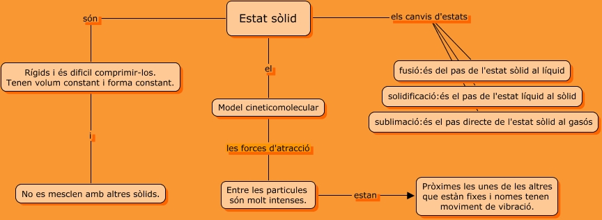 Este Cmap, tiene información relacionada con: El sòlid, Estat sòlid els canvis d'estats fusió:és del pas de l'estat sòlid al líquid, Estat sòlid el Model cineticomolecular, Model cineticomolecular les forces d'atracció Entre les particules són molt intenses., Estat sòlid són Rígids i és dificil comprimir-los. Tenen volum constant i forma constant., Estat sòlid els canvis d'estats solidificació:és el pas de l'estat líquid al sòlid, Entre les particules són molt intenses. estan Pròximes les unes de les altres que estàn fixes i nomes tenen moviment de vibració., Estat sòlid els canvis d'estats sublimació:és el pas directe de l'estat sòlid al gasós, Rígids i és dificil comprimir-los. Tenen volum constant i forma constant. i No es mesclen amb altres sòlids.