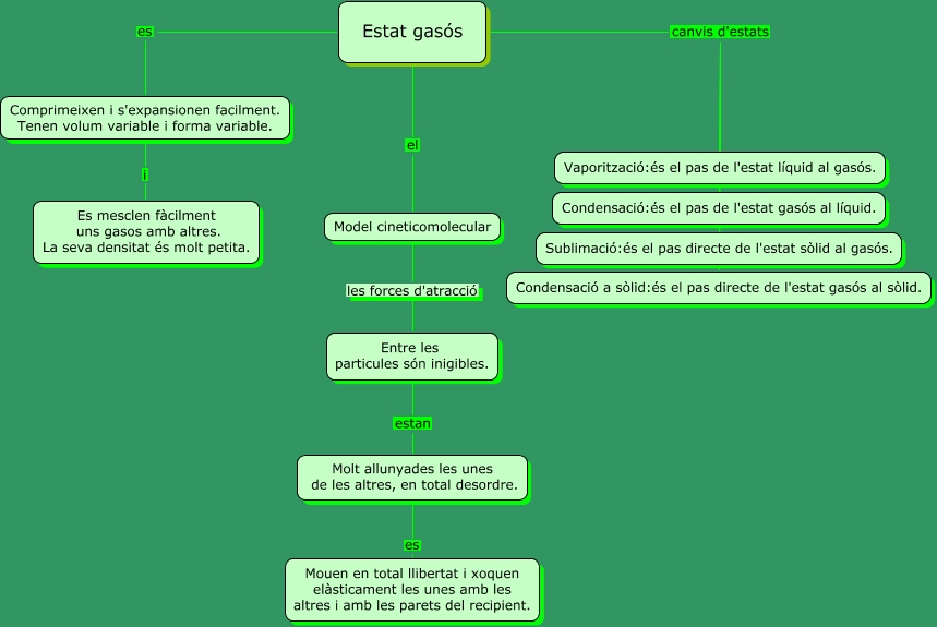 Este Cmap, tiene información relacionada con: El gas, Estat gasós el Model cineticomolecular, Estat gasós canvis d'estats Condensació:és el pas de l'estat gasós al líquid., Estat gasós canvis d'estats Vaporització:és el pas de l'estat líquid al gasós., Entre les particules són inigibles. estan Molt allunyades les unes de les altres, en total desordre., Estat gasós es Comprimeixen i s'expansionen facilment. Tenen volum variable i forma variable., Comprimeixen i s'expansionen facilment. Tenen volum variable i forma variable. i Es mesclen fàcilment uns gasos amb altres. La seva densitat és molt petita., Molt allunyades les unes de les altres, en total desordre. es Mouen en total llibertat i xoquen elàsticament les unes amb les altres i amb les parets del recipient., Estat gasós canvis d'estats Condensació a sòlid:és el pas directe de l'estat gasós al sòlid., Model cineticomolecular les forces d'atracció Entre les particules són inigibles., Estat gasós canvis d'estats Sublimació:és el pas directe de l'estat sòlid al gasós.
