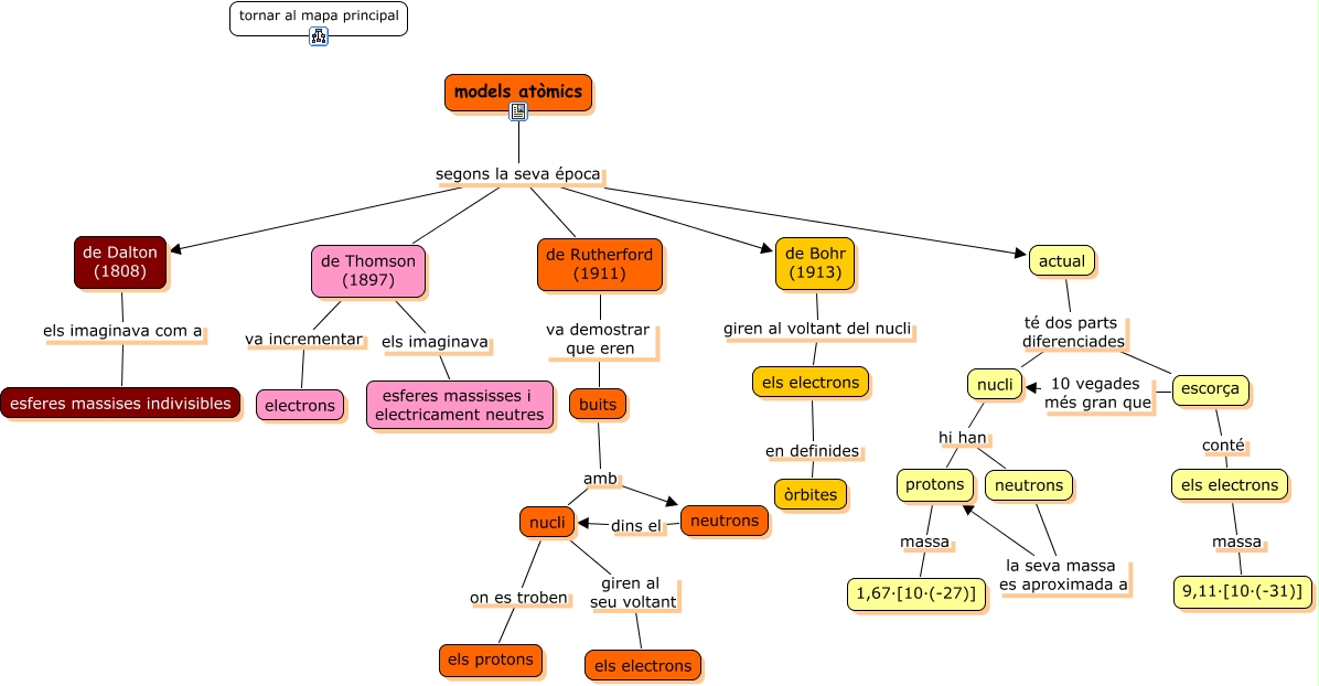 Este Cmap, tiene información relacionada con: models atòmics, models atòmics segons la seva época actual, els electrons massa 9,11·[10·(-31)], actual té dos parts diferenciades escorça, protons massa 1,67·[10·(-27)], de Thomson (1897) els imaginava esferes massisses i electricament neutres, els electrons en definides òrbites, nucli hi han neutrons, models atòmics segons la seva época de Rutherford (1911), escorça 10 vegades més gran que nucli, de Dalton (1808) els imaginava com a esferes massises indivisibles, buits amb nucli, nucli giren al seu voltant els electrons, models atòmics segons la seva época de Thomson (1897), escorça conté els electrons, de Bohr (1913) giren al voltant del nucli els electrons, models atòmics segons la seva época de Bohr (1913), buits amb neutrons, models atòmics segons la seva época de Dalton (1808), nucli on es troben els protons, actual té dos parts diferenciades nucli