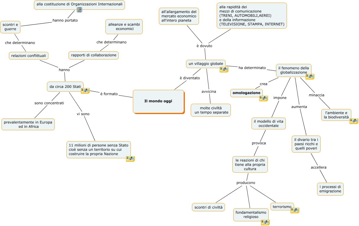 Questa Cmap, creata con IHMC CmapTools, contiene informazioni relative a: il mondo oggi (Dario Marotta 3^C), da circa 200 Stati vi sono 11 milioni di persone senza Stato cioè senza un territorio su cui costruire la propria Nazione, da circa 200 Stati hanno relazioni conflittuali, Il mondo oggi è formato da circa 200 Stati, le reazioni di chi tiene alla propria cultura producono scontri di civiltà, da circa 200 Stati sono concentrati prevalentemente in Europa ed in Africa, un villaggio globale avvicina molte civiltà un tempo separate, Il mondo oggi è diventato un villaggio globale, un villaggio globale ha determinato ????, il fenomeno della globalizzazione impone il modello di vita occidentale, il divario tra i paesi ricchi e quelli poveri accellera i processi di emigrazione, scontri e guerre hanno portato alla costituzione di Organizzazioni Internazionali, le reazioni di chi tiene alla propria cultura producono fondamentalismo religioso, le reazioni di chi tiene alla propria cultura producono terrorismo, il fenomeno della globalizzazione crea omologazione, il fenomeno della globalizzazione aumenta il divario tra i paesi ricchi e quelli poveri, un villaggio globale è dovuto alla rapidità dei mezzi di comunicazione (TRENI, AUTOMOBILI,AEREI) e della informazione (TELEVISIONE, STAMPA, INTERNET), il modello di vita occidentale provoca le reazioni di chi tiene alla propria cultura, il fenomeno della globalizzazione minaccia l'ambiente e la biodiversità, relazioni conflittuali che determinano scontri e guerre, da circa 200 Stati hanno rapporti di collaborazione