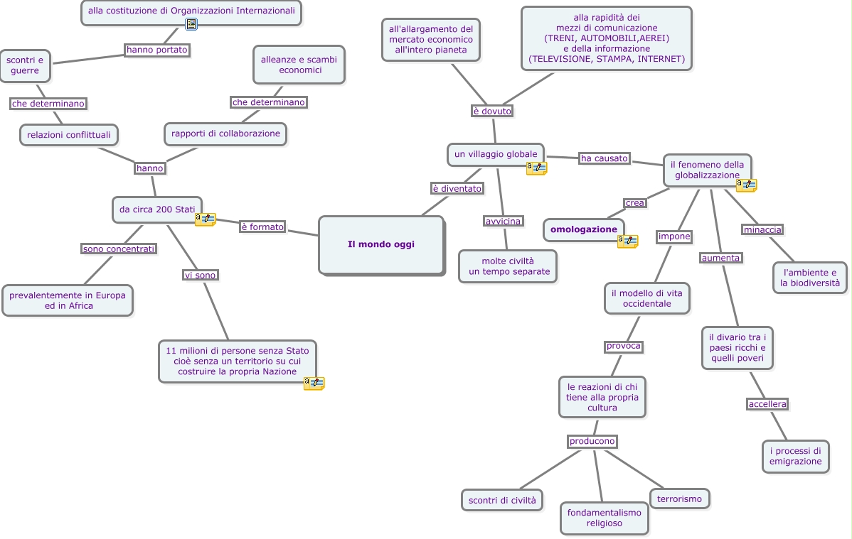 Questa Cmap, creata con IHMC CmapTools, contiene informazioni relative a: Il mondo oggi (Elisa Stea e Alessandra Tassiello 3^c), il fenomeno della globalizzazione crea omologazione, un villaggio globale è dovuto all'allargamento del mercato economico all'intero pianeta, relazioni conflittuali che determinano scontri e guerre, le reazioni di chi tiene alla propria cultura producono scontri di civiltà, da circa 200 Stati hanno relazioni conflittuali, il fenomeno della globalizzazione impone il modello di vita occidentale, le reazioni di chi tiene alla propria cultura producono terrorismo, un villaggio globale è dovuto alla rapidità dei mezzi di comunicazione (TRENI, AUTOMOBILI,AEREI) e della informazione (TELEVISIONE, STAMPA, INTERNET), il fenomeno della globalizzazione minaccia l'ambiente e la biodiversità, da circa 200 Stati vi sono 11 milioni di persone senza Stato cioè senza un territorio su cui costruire la propria Nazione, il modello di vita occidentale provoca le reazioni di chi tiene alla propria cultura, il divario tra i paesi ricchi e quelli poveri accellera i processi di emigrazione, le reazioni di chi tiene alla propria cultura producono fondamentalismo religioso, rapporti di collaborazione che determinano alleanze e scambi economici, un villaggio globale avvicina molte civiltà un tempo separate, da circa 200 Stati sono concentrati prevalentemente in Europa ed in Africa, scontri e guerre hanno portato alla costituzione di Organizzazioni Internazionali, da circa 200 Stati hanno rapporti di collaborazione, Il mondo oggi è formato da circa 200 Stati, Il mondo oggi è diventato un villaggio globale