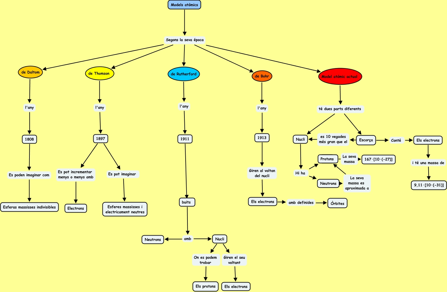 Este Cmap, tiene información relacionada con: Models atòmics, 1897 Es pot incrementar menys o menys amb Electrons, Protons La seva massa 167·[10·(-27)], Models atòmics Segons la seva época de Daltom, buits amb Nucli, 1913 Giren al voltan del nucli Els electrons, Models atòmics Segons la seva época de Rutherford, Models atòmics Segons la seva época de Thomson, Nucli Hi ha Neutrons, Escorça Conté Els electrons, Els electrons i té una massa de 9,11·[10·(-31)], Escorça es 10 vegades més gran que el Nucli, Model atòmic actual té dues parts diferents Nucli, 1911 ???? buits, 1897 Es pot imaginar Esferes massisses i electricament neutres, Els electrons amb definides Òrbites, de Daltom l'any 1808, de Bohr l'any 1913, Models atòmics Segons la seva época de Bohr, buits amb Neutrons, Models atòmics Segons la seva época Model atòmic actual