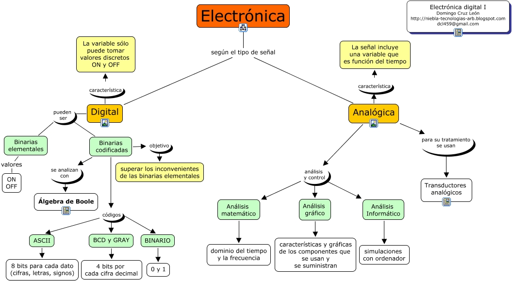 Este Cmap, tiene información relacionada con: electrónica digital I, Digital pueden ser Binarias elementales, Análisis matemático dominio del tiempo y la frecuencia, Binarias codificadas códigos BCD y GRAY, Electrónica según el tipo de señal Digital, Digital característica La variable sólo puede tomar valores discretos ON y OFF, Analógica para su tratamiento se usan Transductores analógicos, BCD y GRAY 4 bits por cada cifra decimal, Analógica análisis y control Análisis Informático, Análisis gráfico características y gráficas de los componentes que se usan y se suministran, Binarias codificadas códigos BINARIO, Electrónica según el tipo de señal Analógica, Binarias codificadas códigos ASCII, Analógica característica La señal incluye una variable que es función del tiempo, Binarias codificadas objetivo superar los inconvenientes de las binarias elementales, Análisis Informático simulaciones con ordenador, Analógica análisis y control Análisis matemático, ASCII 8 bits para cada dato (cifras, letras, signos), Binarias elementales valores ON OFF, Digital pueden ser Binarias codificadas, BINARIO 0 y 1